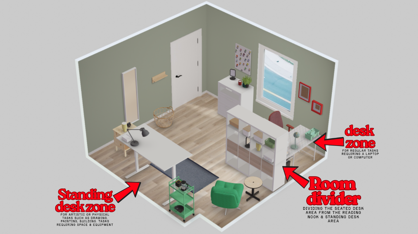 Built-in desks, reading nooks/shelves or a whiteboard may help you visually transition between tasks. A room divider or differing wall and furniture colours could be used to the same effect. A calming lavender or sage can boost focus, while an accent chair or room divider can visually separate your workspace from the rest of the room.