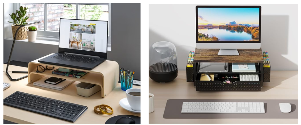 A laptop/monitor stand ($19) or a budget friendly tiered organiser/riser ($24) could elevate the above options, providing more usable tabletop or desktop space for other items.