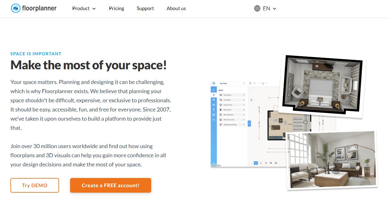 Floorplanner is another popular platform that has been around for more than 15 years. It offers a clean browser-based interface with a notably large library of items. It has a similar feature set to Planner 5D but is only available via a browser. It is a very popular platform with interesting features that enable conversion of 2D plans to 3D renderings and the ability for virtual tours.